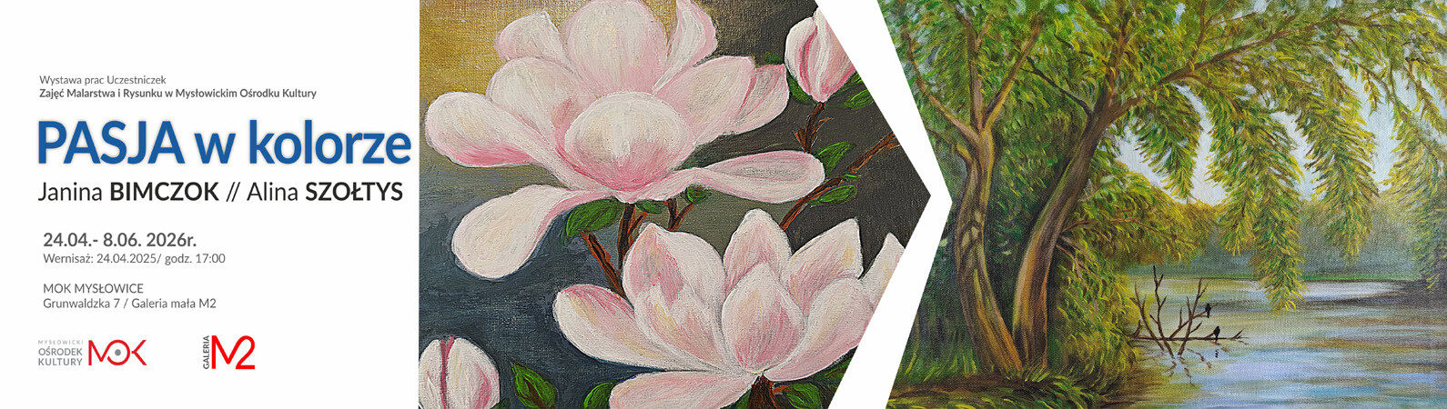 Wystawa malarstwa „Pasja w kolorze” prezentuje prace dwóch mysłowickich seniorek – Janiny Bimczok i Aliny Szołtys. Artystki łączy wspólna miłość do sztuki oraz potrzeba twórczego wyrażania siebie.